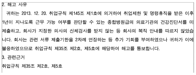 피고는 원고에 대하여 2015. 1. 12. 해고 통보를 하였는데, 위 해고 통보서에는 해고 사유에 관하여 '귀하는 2013. 12. 20. 취업규칙 제145조 제1호에 의거하여 취업제한 및 명령휴직을 받은 이후 1년이 지나도록 근무 가능 여부를 판단할 수 있는 종합병원급의 의료기관의 건강진단서를 미제출하고, 회사가 지정한 의사의 신체검사를 받지 않는 등 회사의 복직 안내를 따르지 않았습니다. 회사는 관련 서류 제출기한을 2차례 연장하는 등 추가 기회를 부여하였으나 귀하가 이에 불응하였으므로 취업규칙 제35조 제2호, 제5호에 해당하여 해고를 통보합니다.'라고 기재되어 있는 사실, 취업규칙 제35조는 해고사유로서 제2호 '질병 기타 건강상 장애로 인해 업무수행이 불가능한 경우', 제5호 '기타 근로관계의 존속을 기대할 수 없다고 판단되는 경우'를 규정하고 있는 사실은 앞에서 본 바와 같다.