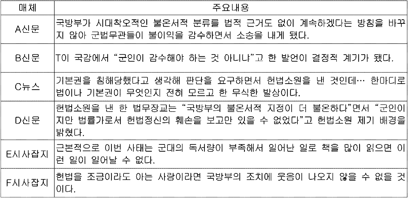 파) AA언론 기자 M는, 2008. 10. 23.자 AA 언론에 「AD」 라는 제목 하에 군법무관들이 이 사건 지시와 그 근거법령이 위헌이라고 반발하고 나서 파장이 일고 있다고 소개하면서 원고 B이 "국방부가 자의적으로 불온서적을 정해 금지하는 것은 군의 정치적 중립성을 해칠 가능성도 농후하다"고 말하였다는 기사를 보도하였고, 2008. 10. 24.자 AA언론에는 「AE」이라는 제목 하에 최근 국방부의 불온서적 소지 · 반입 금지 지시에 반발해 헌법소원을 낸 군법무관 A씨(원고 B을 가리키는 것으로 보인다)를 만났는 데 A씨는 "국방부가 불온서적을 지정하고 그에 따른 조치를 취하는 것은 양심형성의 자유를 옥죄는 것이라고 느꼈고, 군인이면서 동시에 법률가로서 이 같은 헌법정신의 훼손을 보고만 있어서는 안 된다고 생각했으며, 군법무관들은 대한민국 군인이라는 사실이 부끄럽다고 입을 모았고, 우리 군의 발전을 위해서는 우선 군이 정치와 야합해 국군에 대한 신뢰와 그 존립목적을 흔들어 버렸던 과거사를 철저히 반성해야 하며, 참여정부 시절 권장도서로 군내 보급까지 됐던 책을 정권이 바뀌자 불온도서로 둔갑시킨 국방부가 더 불온한 것 아니냐"고 말하였다는 기사를 보도하였다.