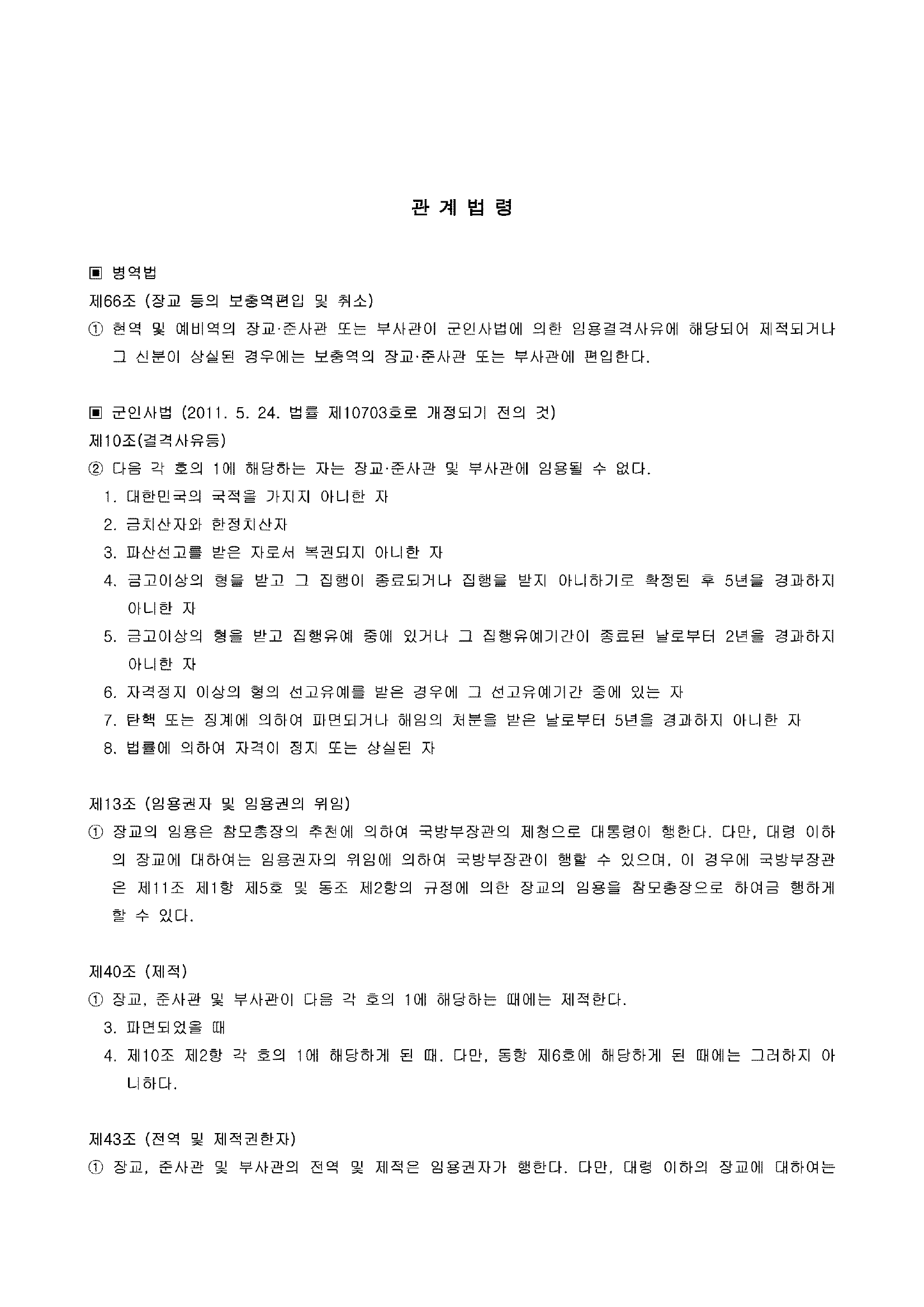 1) 군인사법 제40조 제1항 제3호, 제4호, 제10조 제2항 제7호에 의하면 장교가 (징계)파면되었을 때 제적되고, 병역법 제66조 제1항에 의하면 현역 장교가 군인사법에 의한 임용결격사유에 해당되어 제적된 경우에는 보충역의 장교에 편입된다 할 것인바, 징계파면된 장교는 행정청의 별도의 처분이 없더라도 위 규정에 의하여 곧바로 제적 및 보충역편입이 되는 것이고, 행정청의 제적 및 보충역편입 명령은 위 규정에 따른 국민의 권리의무 변동을 확인 · 통지하는 것에 불과하며, 그러한 행정청의 제적 및 보충역편입 명령으로 인하여 그 상대방인 국민의 권리의무 또는 법률상 지위에 직접적 변동을 초래한다고 할 수 없으므로, 피고 장관의 원고 A에 대한 제적 및 보충역편입명령은 항고소송의 대상인 처분에 해당하지 아니한다(이러한 경우 파면된 장교는 당해 파면처분의 취소 등을 구하여 그 파면처분을 근거로 한 제적 및 보충역편입에서 구제될 수 있을 것이다).