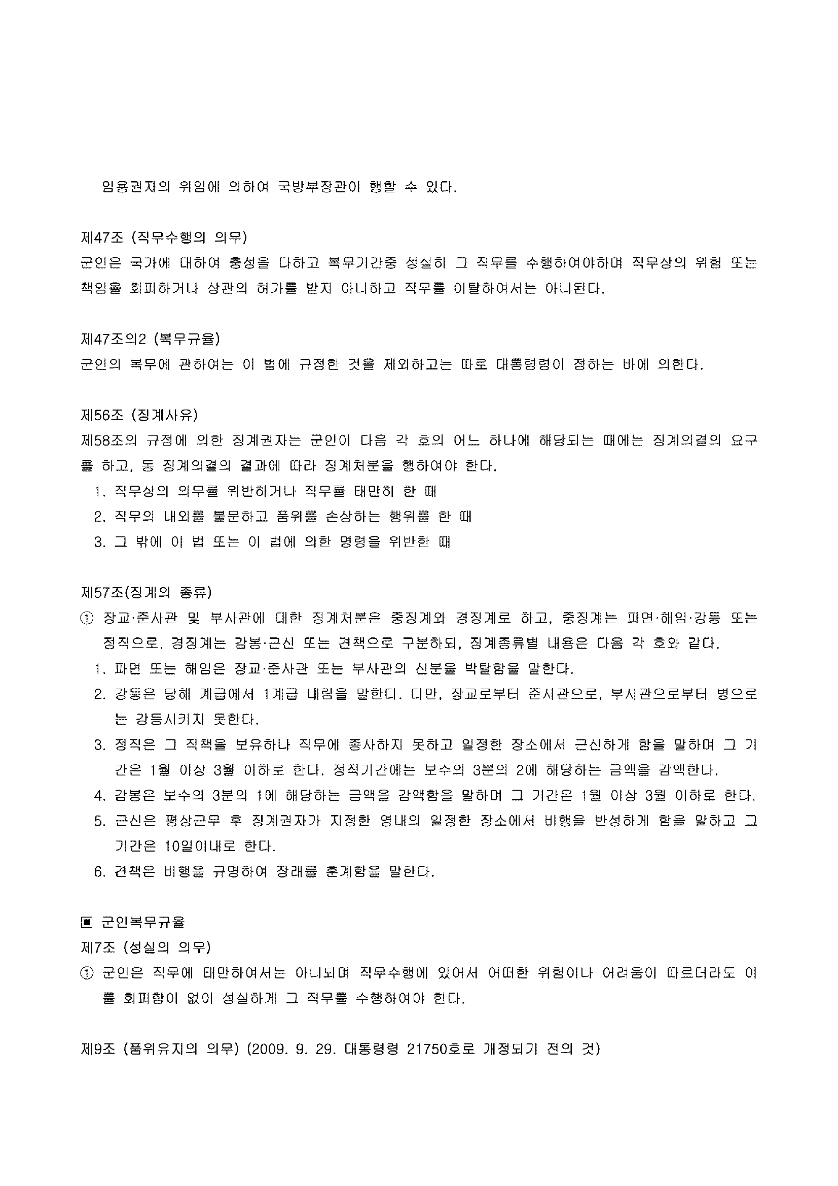 또한 군인사법 제56조 제2호는 군인이 직무의 내외를 불문하고 품위를 손상하는 행위를 한 경우를 징계사유의 하나로 규정하고 있고, 군인복무규율 제9조에 의하면 군인은 군의 위신과 군인으로서의 명예를 손상시키는 행동을 하여서는 아니되며 품위를 유지하여야 한다고 규정하고 있는바, 앞서 본 바와 같이 군대는 일반 사회와는 구별되는 특수한 신분∙권력관계가 인정되는 조직이므로 비록 사회에서 허용되는 표현이라 하더라도 군에 대한 신뢰를 손상시키고 선동적 · 모욕적이며 무절제 · 무례한 언행을 하거나 상관의 명령에 반발하는 듯한 언행을 하여 군의 위신이나 군인으로서의 품위를 손상시키고 군의 지휘체계를 문란하게 하는 것은 위 규정상의 징계사유에 해당한다 할 것이다.
