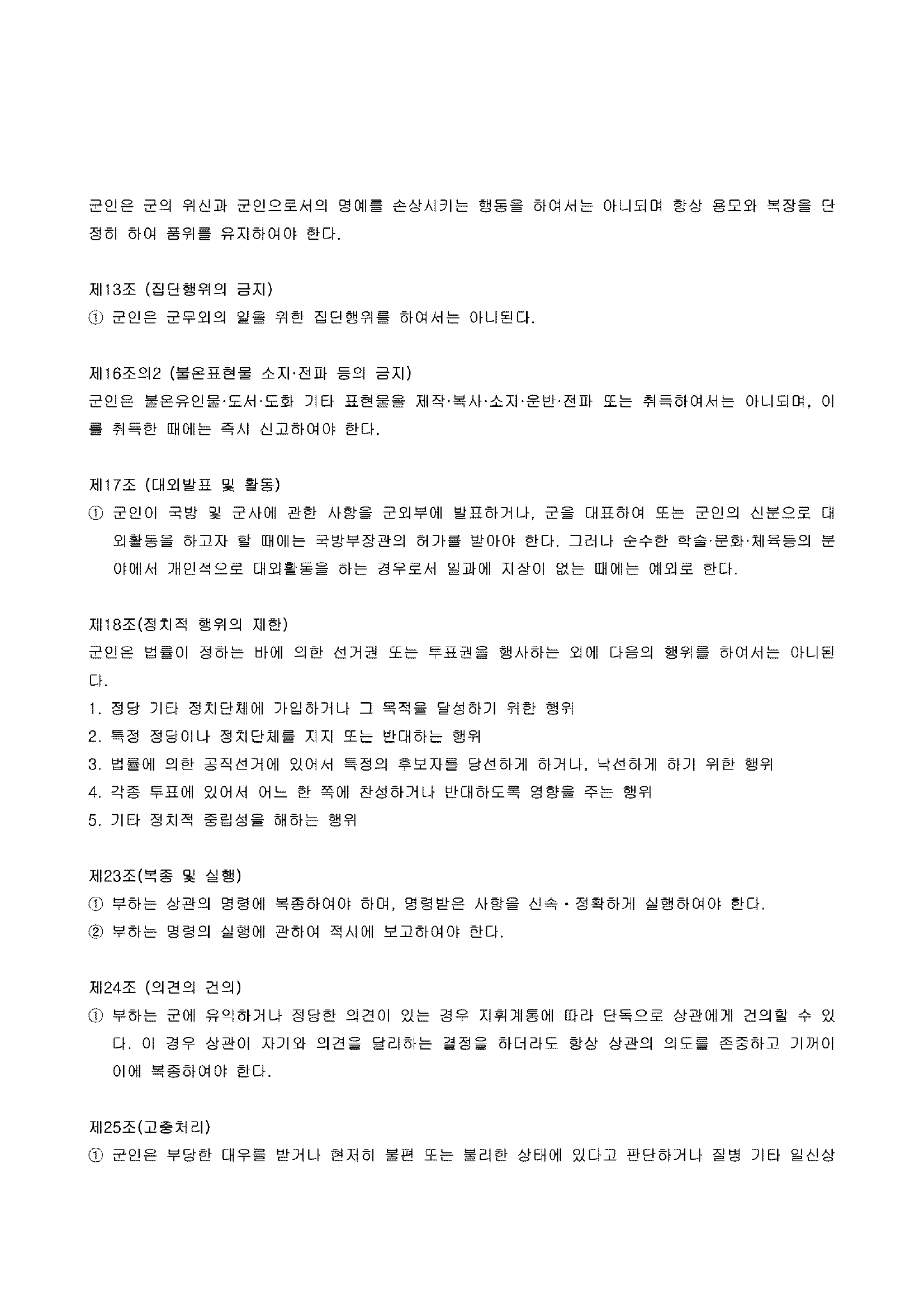 그러나 앞서 본 바와 같이 군조직의 특수성으로 인하여 군인의 기본권은 특별한 제한을 받게 된다고 할 수 있는데, 군인복무규율 제23조 제1항은 '부하는 상관의 명령에 복종하여야 하며, 명령받은 사항을 신속·정확하게 실행하여야 한다'고 규정하고 있고, 제24조 제1항은 '부하는 군에 유익하거나 정당한 의견이 있는 경우 지휘계통에 따라 단독으로 상관에게 건의할 수 있다. 이 경우 상관이 자기와 의견을 달리하는 결정을 하더라도 항상 상관의 의도를 존중하고 기꺼이 이에 복종하여야 한다'고 규정하고 있으며, 제25조 제1항은 '군인은 부당한 대우를 받거나 현저히 불편 또는 불리한 상태에 있다고 판단하거나 질병 기타 일신상의 사정으로 업무수행이 곤란할 경우에는 이를 지휘계통에 따라 상담 또는 건의하거나, 군인사법 제51조의3 및 같은 법 시행령 제60조의5에 따라 고충심사를 청구할 수 있다'고 규정하고 있고, 제25조 제4항은 '군인은 복무와 관련된 고충사항을 진정 · 집단서명 기타 법령이 정하지 아니한 방법을 통하여 군 외부에 그 해결을 요청하여서는 아니된다'고 규정하고 있는바, 위 각 문언의 내용과 취지를 고려하여 보면, 군인은 상관의 지시나 명령이 있는 경우 이에 대하여 다른 의견이 있다 하더라도 지휘계통을 통하여 상관에게 이를 건의하여야 하고 그러한 지휘계통을 통하지 아니하고 군 외부에 그 해결을 요청하는 것은 특별한 사정이 없는 한 이를 금지하고 있다고 봄이 상당하다.