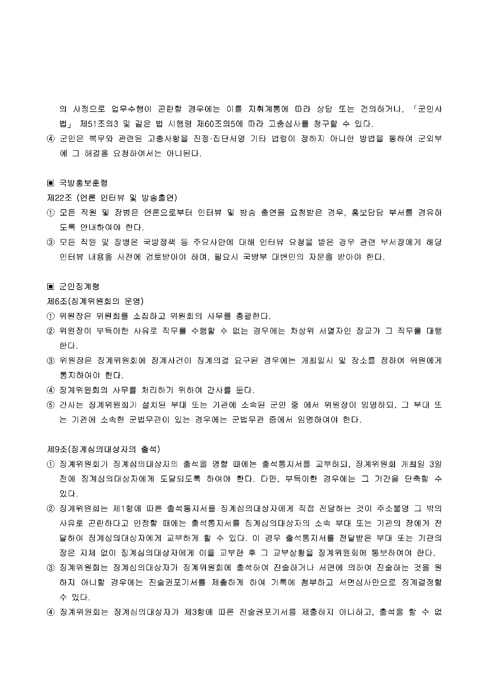 (1) 군인복무규율 제17조 제1항, 국방홍보훈령 제22조 제1항, 제3항에 의하면, 군인은 국방부장관의 허가를 받지 아니하고 국방 및 군사에 관한 사항을 군 외부에 발표하거나 군인의 신분으로 대외활동을 하여서는 아니되고, 언론으로부터 국방정책 등 주요사안에 대하여 인터뷰 요청을 받은 경우에는 홍보담당부서를 경유하도록 안내하여야 하며, 인터뷰에 응할 경우에는 관련부서장에게 인터뷰 내용을 사전에 검토 받아야 한다고 규정하고 있는바, 위 규정들은 국방정책 등 주요사안에 관하여 군을 대표하지 못하는 군인이 개인자격으로 무분별하게 군 외부에 직접 자신의 의견을 발표하거나 언론의 인터뷰에 응함으로 인하여 발생할 수 있는 혼란과 군에 대한 신뢰를 손상시키는 것을 방지하려는 데에 그 목적이 있다 할 것이다.