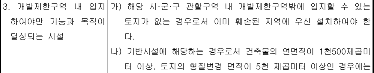 한편, 구 개발제한법 제12조 제1항 제1호에서 개발제한구역에서의 건축물의 건축과 같은 행위를 원칙적으로 금하되, 다만 예외적으로 폐기물처리시설과 같은 공익시설로 서 대통령령으로 정하는 건축물의 경우에는 시장·군수·구청장의 허가를 받아 그 행위 를 할 수 있다고 규정하고 있고, 구 개발제한법 시행령 제13조 제1항 별표1에서는 개 발제한구역에서 설치할 수 있는 건축물의 종류, 건축 또는 설치의 범위에 관하여 규정 하면서 폐기물처리시설을 포함한 공익시설에 관하여 ‘기반시설에 해당하는 경우로서 건축물의 연면적이 1,500m 이상, 토지의 형질변경 면적이 5,000m 이상인 경우에는 도 시계획시설로 설치하여야 한다'고 규정하고 있다.
