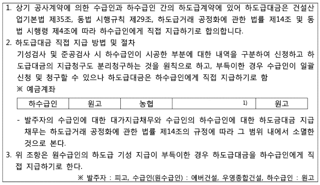위 인정사실에 의하면, 원고, 피고, 에버건설, 우영종합건설 사이에 하도급거래 공정화에 관한 법률(이하 '하도급법'이라 한다) 제14조 제1항 제2호에 따라 하도급대금직 불합의가 이루어진 점(하도급대금직불합의서에 하도급법 관련 조문과 함께 건설산업기본법 관련 조문도 함께 기재되어 있으나 하도급법 제34조에 따라 건설산업기본법 제35조에 앞서 하도급법 제14조가 우선 적용된다), 원도급계약 및 하도급계약에 따른 공사가 모두 완료된 점, 하도급계약 및 원도급계약에 따른 각 공사완료일 무렵을 기준으로 하도급계약에 따른 잔금이 원도급계약에 따른 잔금의 범위 내에 있는 점 등의 사정이 인정된다.